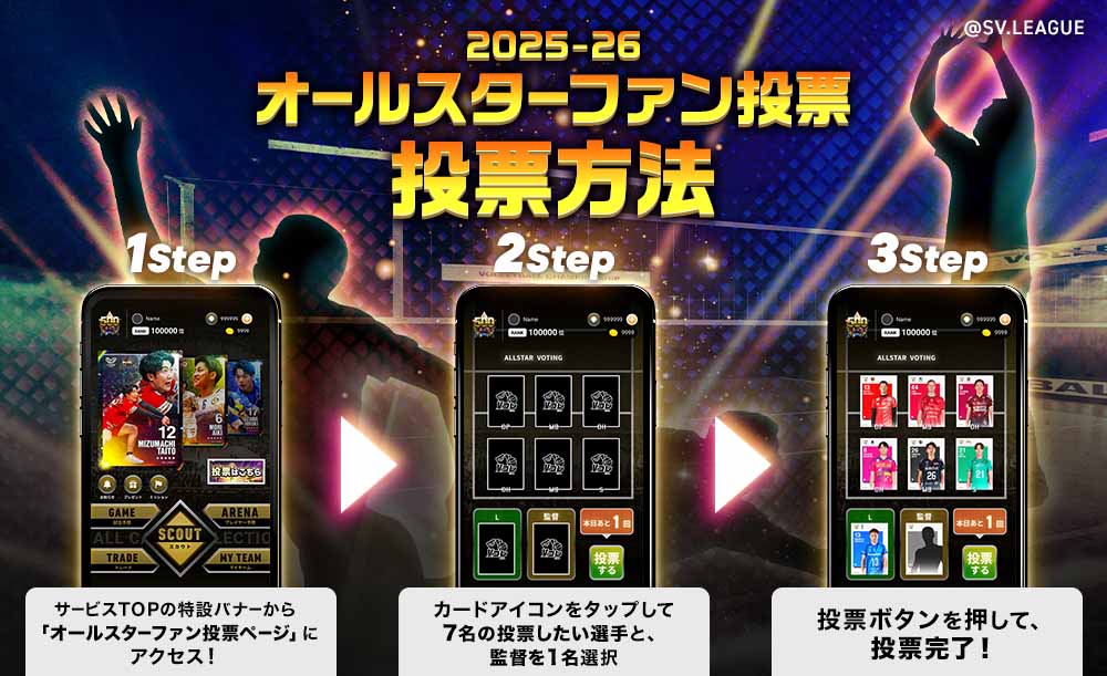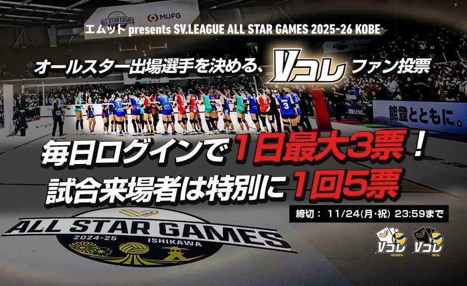 公益社団法人SVリーグのゴールドパートナーとしてSV.LEAGUE公式カードコレクション「VOLLEYBALL CARD COLLECTION」や公式アプリ「スマートV」の開発・運営などリーグの活動を支援する株式会社VOLZ(ヴォルツ、旧社名:株式会社Tixplus、本社:東京都渋谷区、代表取締役:池田宗多朗、以下VOLZ)は、公式カードコレクションサービス「VOLLEYBALL CARD COLLECTION(Vコレ-MEN-)」において、2026年2月1日(日)に開催する「エムット presents SV.LEAGUE ALL STAR GAMES 2025-26 KOBE」のファン投票の受付を開始いたしましたことをお知らせいたします。