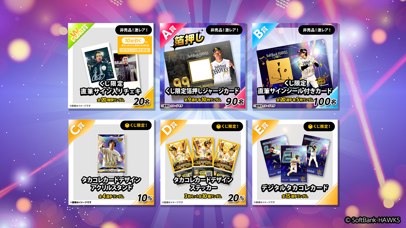 この「タカコレくじ」はオンラインくじプラットフォーム「くじプラ」にて販売いたします。選手の直筆サインシール付きのファンフェスティバル2025デザインの激レア非売品カードを100名様に、同じく、ファンフェスティバル2025デザインのアクリルスタンドも当たります。