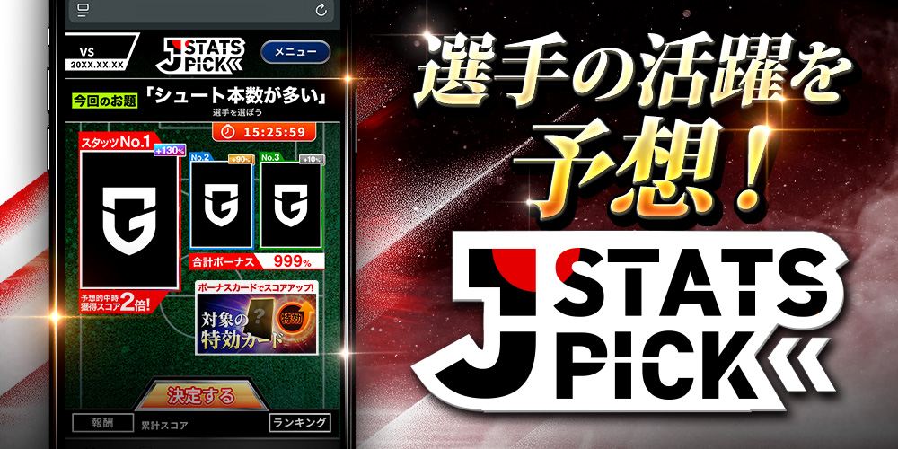実際の試合データと連動した予想参加型コンテンツ「J STATS PICK」は今シーズンも開催。 試合ごとに設定される「テーマ(お題)」に合わせて活躍が期待される選手を3名選出し、実際の試合データに基づいたスコアでランキングを競います。 予想を的中させて上位に入賞すると、豪華報酬や限定カードを獲得可能です。さらに、特定のカードを所持・設定することで獲得スコアがアップする「特効」機能も搭載。集めたカードを活用し、戦略的に試合予想を楽しみましょう。