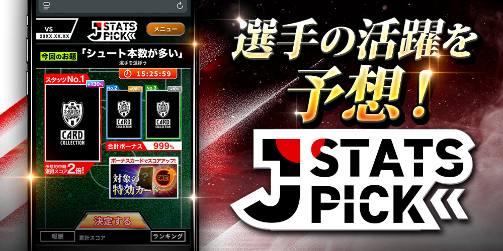 実際の試合データと連動した予想参加型コンテンツ「J STATS PICK」は今シーズンも開催。 試合ごとに設定される「テーマ(お題)」に合わせて活躍が期待される選手を3名選出し、実際の試合データに基づいたスコアでランキングを競います。 予想を的中させて上位に入賞すると、豪華報酬や限定カードを獲得可能です。さらに、特定のカードを所持・設定することで獲得スコアがアップする「特効」機能も搭載。集めたカードを活用し、戦略的に試合予想を楽しみましょう。