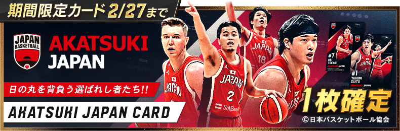 バスケットボール男子日本代表チームが新体制になり、重要な初戦が、いよいよ2月26日(木)より開催されます。 日本代表選手たちの雄姿をファンの皆様へ届けるべく、「B.LEAGUE CARD」にて新シリーズ「AKATSUKI JAPAN」をリリースいたします。